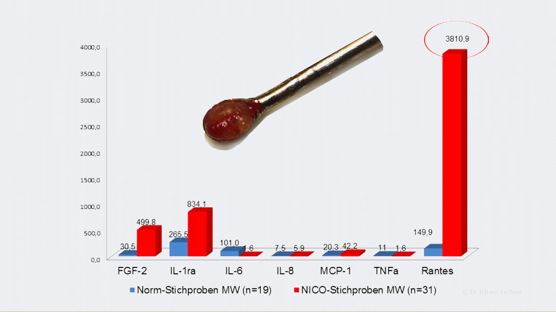 Von besonderer Bedeutung ist der RANTES-Wert. RANTES (Regulated And Normal T cell Expressed and Secreted) ist ein Chemokin mit chemotaktischer Wirkung. Erhöhte RANTES-Spiegel im Blut treten bei zahlreichen systemischen Entzündungserkrankungen auf. Studien von Dr. Johann Lechner (München) weisen auf eine unmittelbare Bedeutung von RANTES bei Patienten mit Kieferosteonekrose (NICO) hin. In dem fettig-osteolytischen Operationsgewebe bei NICO waren in allen untersuchten Fällen sehr hohe lokale RANTES-Spiegel messbar.